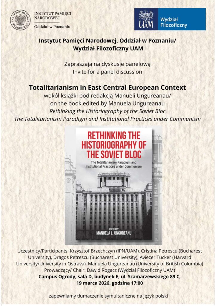 Instytut Pamięci Narodowej, Oddział w Poznaniu oraz Wydział Filozoficzny UAM zapraszają na dyskusję panelową z udziałem Krzysztofa Brzechczyna, Cristiny Petrescu, Dragosa Petrescu, Aviezera Tuckera, Manueli Ungureanau i Dawida Rogacza, pt. “Totalitarianism in East Central European Context”, czwartek 19 marca, godz. 17:00, Poznań, ul. Szamarzewskiego 89, sala D, budynek E