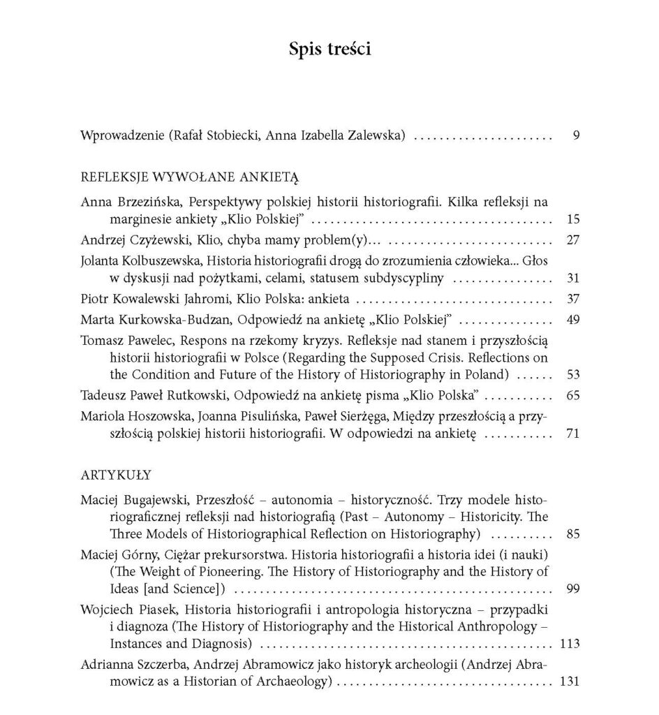 „Przyświecał nam pomysł ożywienia rozmowy środowiskowej, nieograniczonej jedynie do grona specjalistek i specjalistów, nad przeszłością, teraźniejszością i przyszłością historii historiografii. W pełni bowiem zgadzamy się z opinią, że o witalności każdej dyscypliny świadczą intensywność i poziom prowadzonej w jej ramach dyskusji tak o własnych osiągnięciach, jak i niedostatkach, jak to ujął Czyżewski. Również i my zdecydowaliśmy się na stworzenie formuły sprzyjającej dialogicznej refleksji historiograficznej, podkreślając tym samym i eksponując jej potencjał do łączenia, a nie dzielenia różnych środowisk. Cieszymy się, że w tomie reprezentowane są wypowiedzi zarówno przedstawicielek i przedstawicieli różnych generacji, jak i różnych specjalizacji, nie tylko ze środowiska osób zajmujących się jako główną specjalnością dziejami historiografii. Reprezentują oni wiodące ośrodki w kraju (Katowice, Kraków, Lublin, Łódź, Rzeszów, Poznań, Warszawa, Toruń). Nasz pierwotny zamysł był taki, aby „zderzyć” ze sobą dwa typy wypowiedzi. Odpowiedzi na ankietę oraz artykuły, których celem byłaby prezentacja wzajemnych relacji między historią historiografii a innymi subdyscyplinami nauki historycznej. Charakter i specyfika niektórych tekstów nadesłanych jako odpowiedzi na ankietę skłoniły nas ostatecznie do uelastycznienia formuły tego numeru „Klio Polska” i wyodrębnienie sekcji Wariancje. Zawarliśmy w niej wypowiedzi, które wymknęły się zarówno pierwszemu, jak i drugiemu spośród zaprojektowanych przez nas modułów. Rozesłana do Koleżanek i Kolegów ankieta zawierała pięć pytań. Oto one: