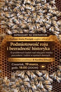 Zapraszamy na seminarium “Podmiotowość roju i bezradność historyka. O problemach badań nad relacjami między pszczołami i ludźmi w epokach dawnych” z udziałem Profesor Anety Pieniądz i dr Karoliny Echaust, czwartek, 19 marca, godz. 18:00 (ZOOM)